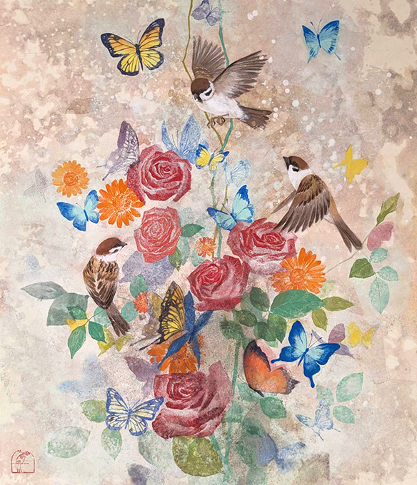 《薔薇と雀》 F10 日本画