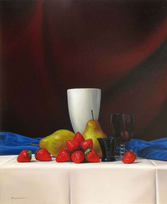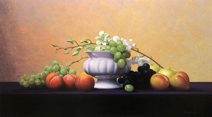 静物画においても背景の技法・色では写実画の枠に囚われない表現を試みています。