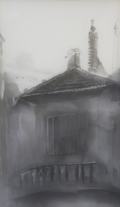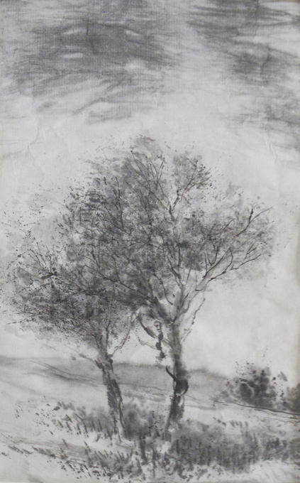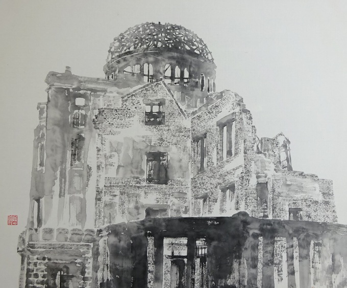 展覧会の名でもある水墨玄空の「玄」と言う文字には、墨色、天の別名、微妙に深遠な理、心理的には微妙な道、はるか遠いこと。といった意味合いがある。まさに墨の素材で描くには、的を射た漢字である。この意味の持つ全てを、紙と墨と水で表現してきたのですが、描き手自身の心理的要素が、作品の目的を左右することは当然、対象物に身構え形態を取る。大気を感じ取り、ものの形態等々全ての要素が積み重なって初めて自分との対決が始まる。善し悪しの決着をつける。大変な重圧感でもある。