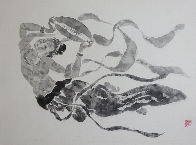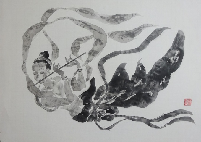 敦煌壁画研究の為、十数回余り莫高窟を訪ね、大和絵(唐絵)の原型とも言われ、岩絵の具で描かれた仏教壁画は、心に染み入るものを感じる。特に、そこに描かれた飛天の、優雅で、緩暢(心地よくて愉快、やすらかな気分)な姿を、いつの頃からか、水墨画で「再現」しようと思うようになった。